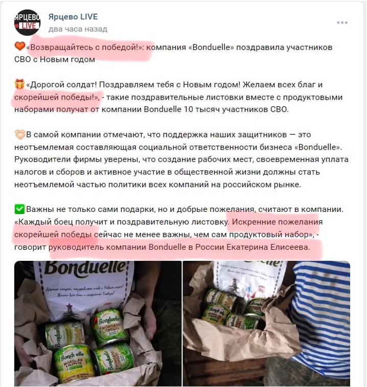 On New Year’s Eve, the group Yartsevo.LIVE on the social network vk.com reported that Bonduelle had congratulated SVO members on the New Year by handing over 10,000 congratulatory grocery baskets to which a postcard was added: “Come back with victory.” As noted, the company itself emphasized that supporting defenders is an integral part of the social responsibility of business.