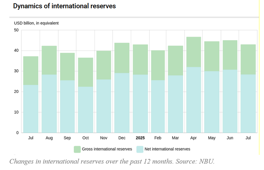International reserves decreased from USD 45.1 billion to USD 43.0 billion in July 2025.