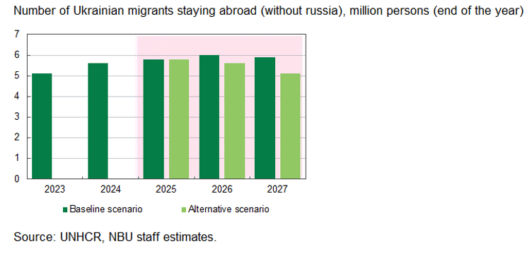 The NBU expects the number of migrants to increase in 2025–2026, primarily due to security factors, by about 200,000 people per year. In 2027, the NBU expects 100,000 Ukrainians to return.