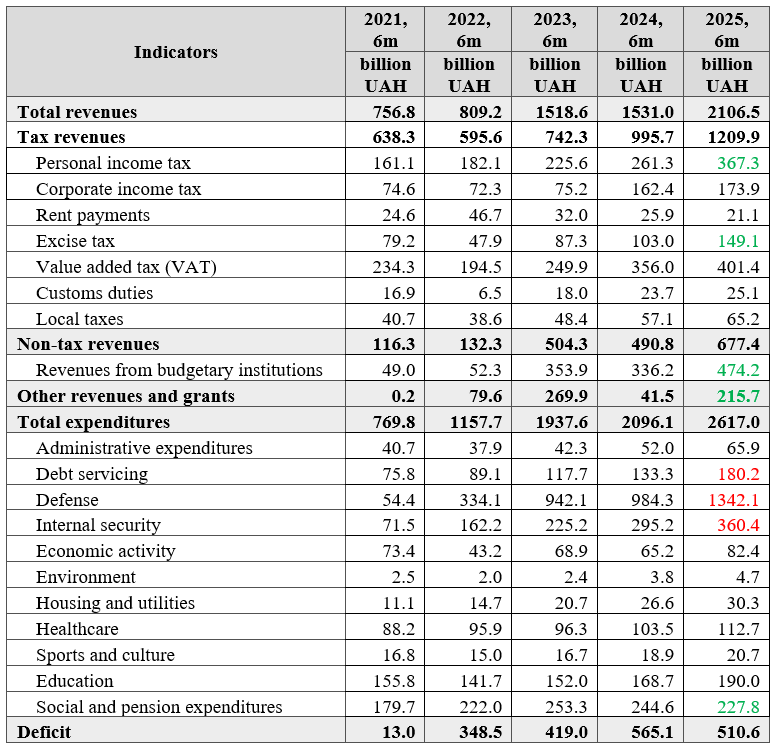 Tax revenues in 2025 were UAH 214.2 billion higher than in the first half of 2024, primarily due to the increase in the military levy and excise taxes.