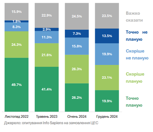 According to the Center for Economic Strategy, in 2024, the share of those considering returning to Ukraine fell significantly from 52.5% to 43%.