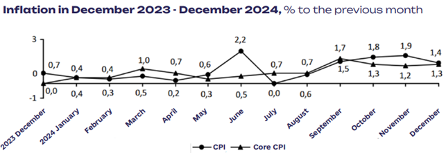 In December 2024, consumer inflation was 1.4% compared to November 2024, and 12.0% for the year.