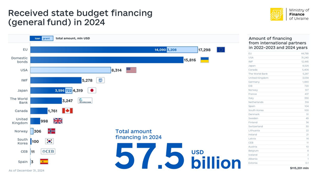 In 2024, Ukraine received USD 41.634 billion in external financing. Of these, 12.553 billion were grants, and 29.081 billion were loans.