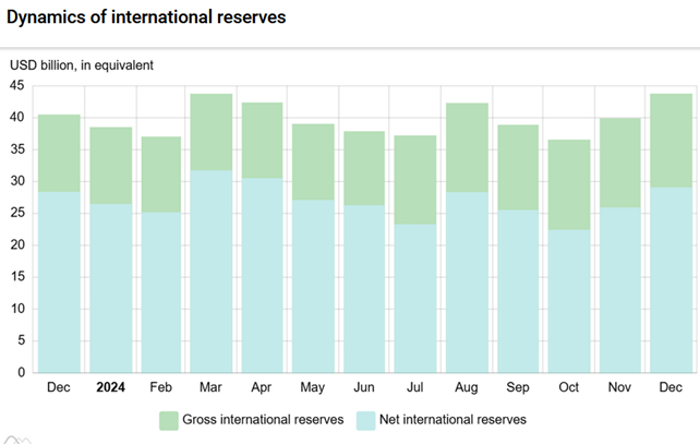 In December 2024, international reserves increased from USD 39.9 billion to USD 43.8 billion. In total, by USD 3.5 billion in 2024.