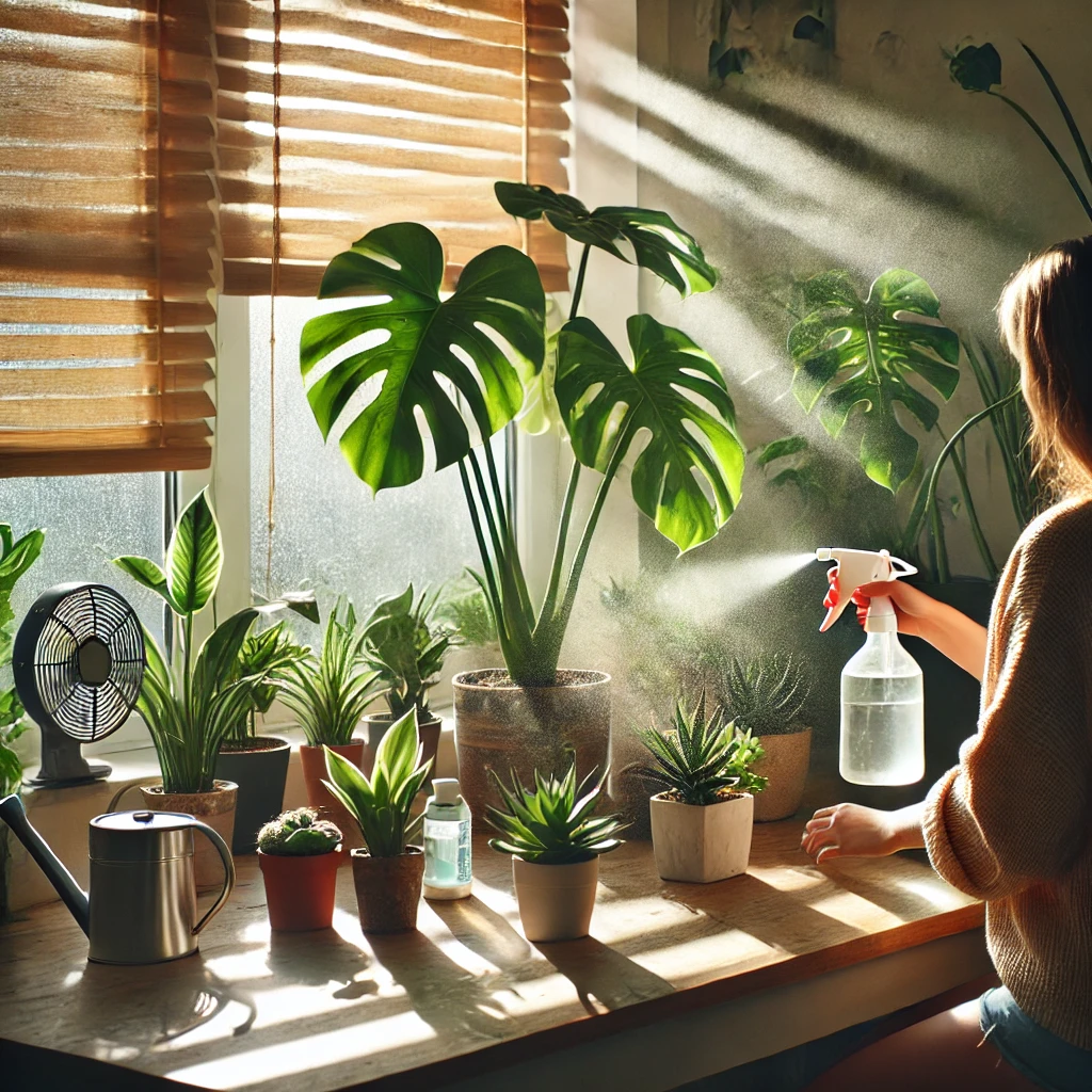 Ще один важливий аспект — вологість повітря. У літню пору, особливо у квартирах із кондиціонерами, повітря стає дуже сухим. Це справжнє випробування для тропічних видів: монстери, фікуси, калатеї та інші декоративно-листяні рослини починають в’янути, скручувати листя або втрачати природний блиск. Щоб допомогти їм, можна використовувати зволожувачі повітря, ставити відкриті ємності з водою поруч з горщиками або обприскувати листя (тільки не під прямим сонцем, щоб уникнути опіків).