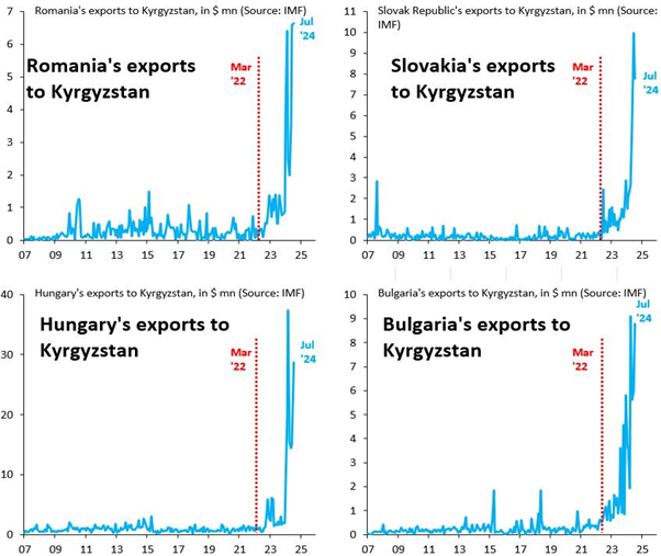 Наприклад, станом на серпень 2024 року з початку російської агресії проти України експорт з Румунії до Киргизії зріс на 2200%, зі Словаччини — на 2500%, Болгарії — 3200%, Угорщини — на 3300% (див. рис. 1):