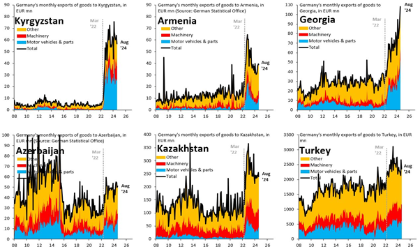 На жаль, до послуг країн-прокладок вдаються і більш розвинені європейські країни, які публічно висловлюють всіляку підтримку Україні, проте не здатні змусити бізнес знехтувати на якийсь час прибутками для запобігання російській експансії. Наприклад, Німеччина з березня 2022 року в рази збільшила постачання промислової продукції в такі країни: як Киргизія, Вірменія, Грузія, Азербайджан, Казахстан, Туреччина (див. рис.2):