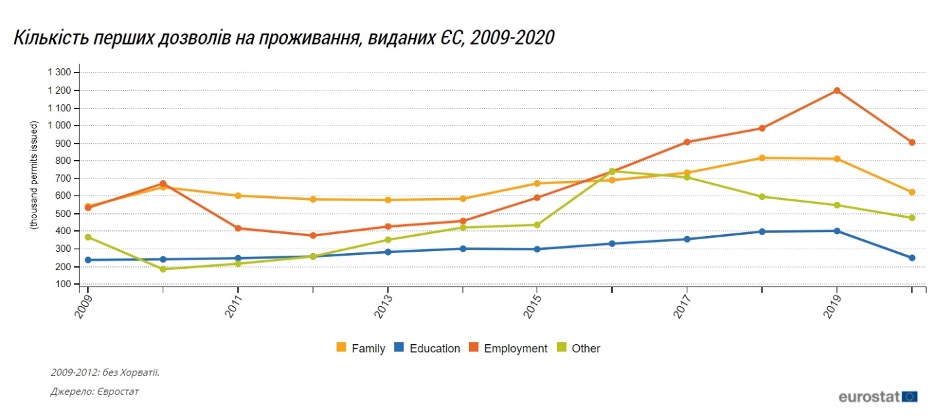 Тож варто уважніше розглянути ті фактори, які найбільше вплинули на поширення попередньої міграційної хвилі. За даними Євростату, кількість чинних дозволів на перебування громадян України на території ЄС-28 протягом останнього десятиліття подвоїлася. Кількість уперше оформлених дозволів на перебування українців лишається найбільшою в порівнянні з іншими країнами походження мігрантів − 527 тис. Переважна більшість із них (78%) видана в Польщі. Майже 90% цих дозволів короткострокові (3–12 місяців), видані у зв’язку з виконанням оплачуваної роботи (65%)[7].