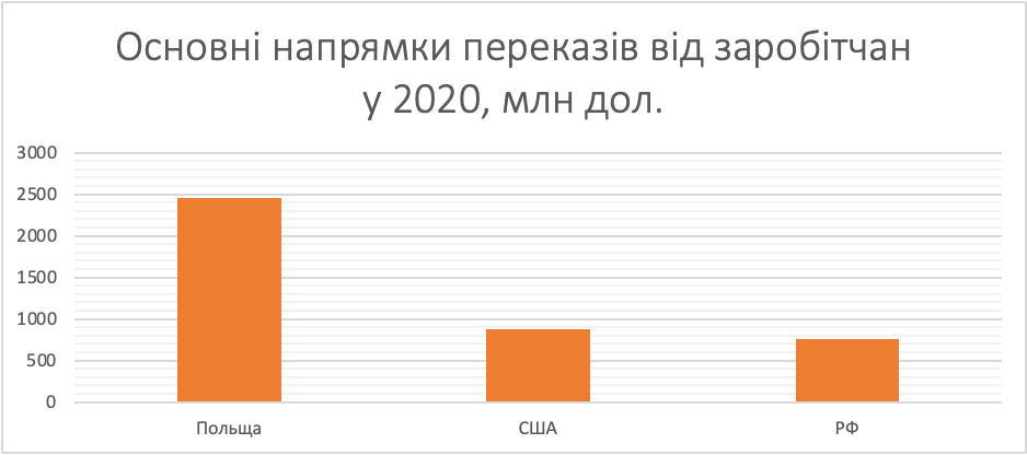 Дані НБУ дають також умовне розуміння напрямків трудової міграції з України, адже у 2020 року найбільше грошей заробітчани переказали з Польщі (як і у 2019 році) – 2,46 млрд дол.