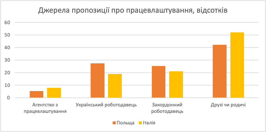 Наявність міцних соціальних контактів за кордоном виступає своєрідною формою соціального капіталу, що дозволяє легше та ефективніше організувати працевлаштування за кордоном, зокрема через полегшення процесу пошуку роботи. Мігранти, які мали попередні угоди про працевлаштування, найчастіше отримували пропозиції про роботу через своїх друзів та родичів. Кожен п’ятий отримав пропозицію безпосередньо від іноземного роботодавця, частка тих, хто отримував роботу завдяки агенції із працевлаштування коливається від 5 до 8%.