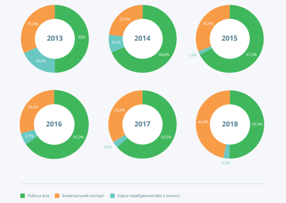 І попри усі його позитивні наслідки, безвіз суттєво вплинув на ріст трудової міграції. Це підтверджує опитування, проведене у 2019 році серед трудових мігрантів[8]. Зокрема, на питання «На підставі яких документів ви востаннє працювали за кордоном?», респонденти відповіли наступним чином:
