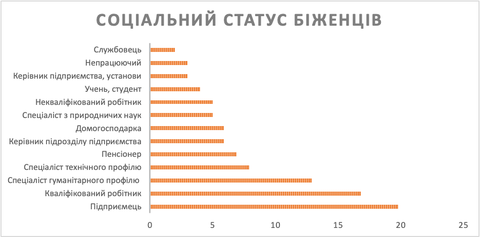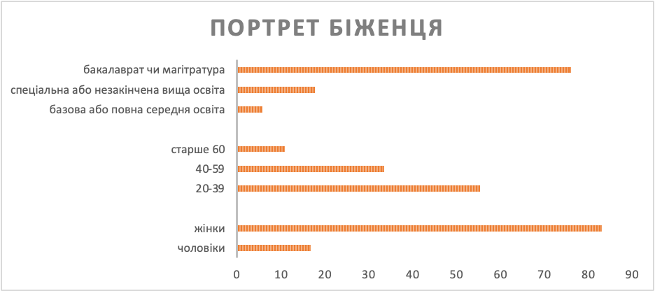 За даними експрес-опитування, проведеного Центром Разумкова[9] в пунктах перетину кордону в Закарпатті (березень 2022 р.), переважна більшість біженців – жінки (83%). При цьому 67,4% опитаних виїжджали за кордон з дітьми чи онуками. Найбільше серед опитаних було мешканців півдня та сходу України (51,5%), а також північного сходу, зокрема Харківської області (19%). Жителі м. Києва та Київської області становили 31%, жителі західних областей – лише 4%.