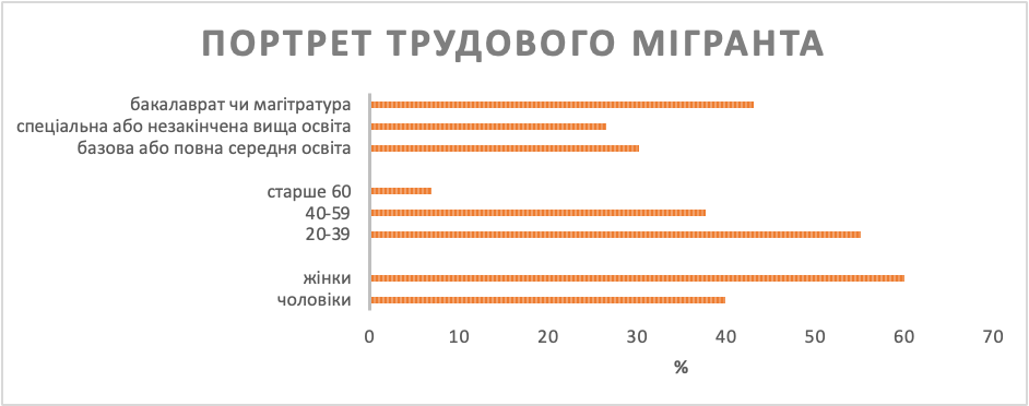 Відповідно до найсвіжіших даних вибіркового соціологічного дослідження трудових мігрантів, проведеного у 2020 році Інститутом демографії та соціальних досліджень ім. М.В. Птухи НАН України, усереднений профіль українського трудового мігранта був наступним: