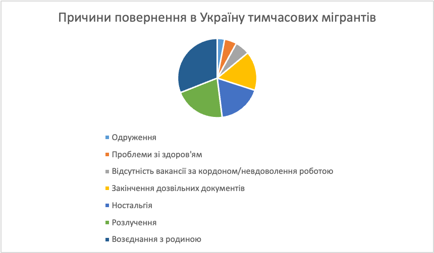 Ще один ризиковий фактор – наявність дітей, які виїхали разом з матерями та літніх батьків, які виїхали із дорослими дітьми. Адже в ході опитувань маятникових мігрантів, з’ясувалося, що абсолютна більшість респондентів (більше 98%) зазначали, що маятникове працевлаштування має значно більше переваг, ніж недоліків. При чому основними перевагами такої стратегії зайнятості за кордоном респонденти називали можливість проводити більше часу з родиною. Зараз, коли діти та літні батьки виїхали разом із працездатними дорослими, відчуття «роз’єднання» з родиною не настільки гостре. Звісно, у більшості таких родин в Україні залишилися родичі-чоловіки працездатного віку, які просто не мають права залишати Україну, але це не є гарантією того, що після завершення війни родина повернеться до батька в Україну, а не навпаки – чекатиме на його приїзд за кордон.