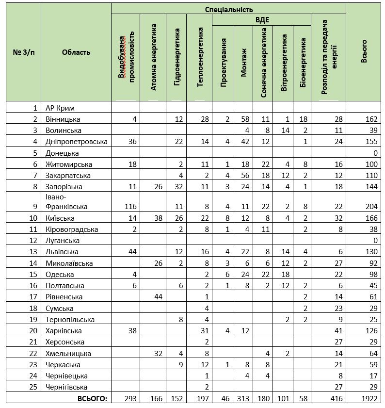 - найбільша потреба є у монтажниках об’єктів «зеленої» енергетики (в першу чергу – сонячних електростанцій) та спеціалістів у видобутку енергетичних корисних копалин (в першу чергу – із видобутку вуглеводнів). Так, наприклад, є попит у видобувної промисловості у кількості 293 осіб, що перевищує сумарний річний випуск зі всіх профільних університетів за цим напрямом підготовки;