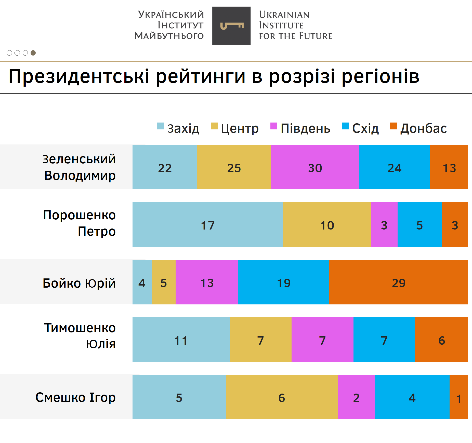 Тим не менш, Донбас залишається відверто проблемни регіоном для В.Зеленського – там він беззаперечно програє Ю.Бойко – 13% до 29%.