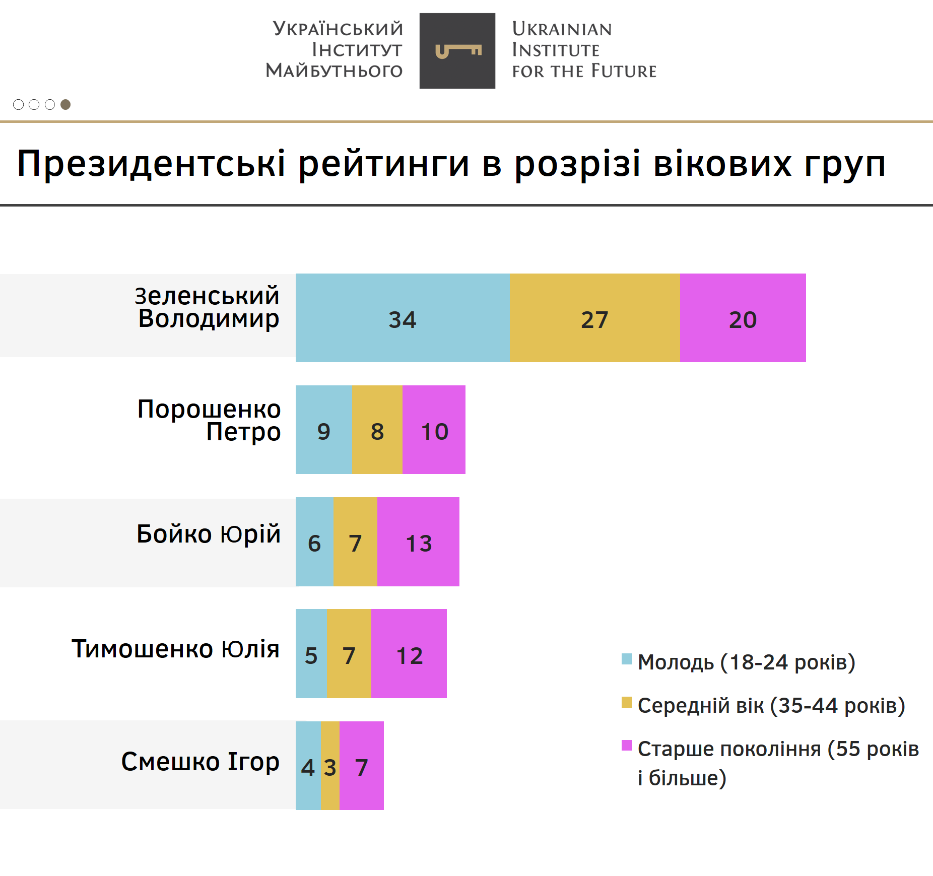 Молодь до 24 років вже традиційно найбільше підтримує В.Зеленського – 34%. Зі збільшенням віку респондентів їхня готовність голосувати за нього зменшується і серед людей старшого віку становить лише 20%. Натомість старші люди вдвічі частіше підтримують Ю.Бойко (13% проти 6% серед молоді).