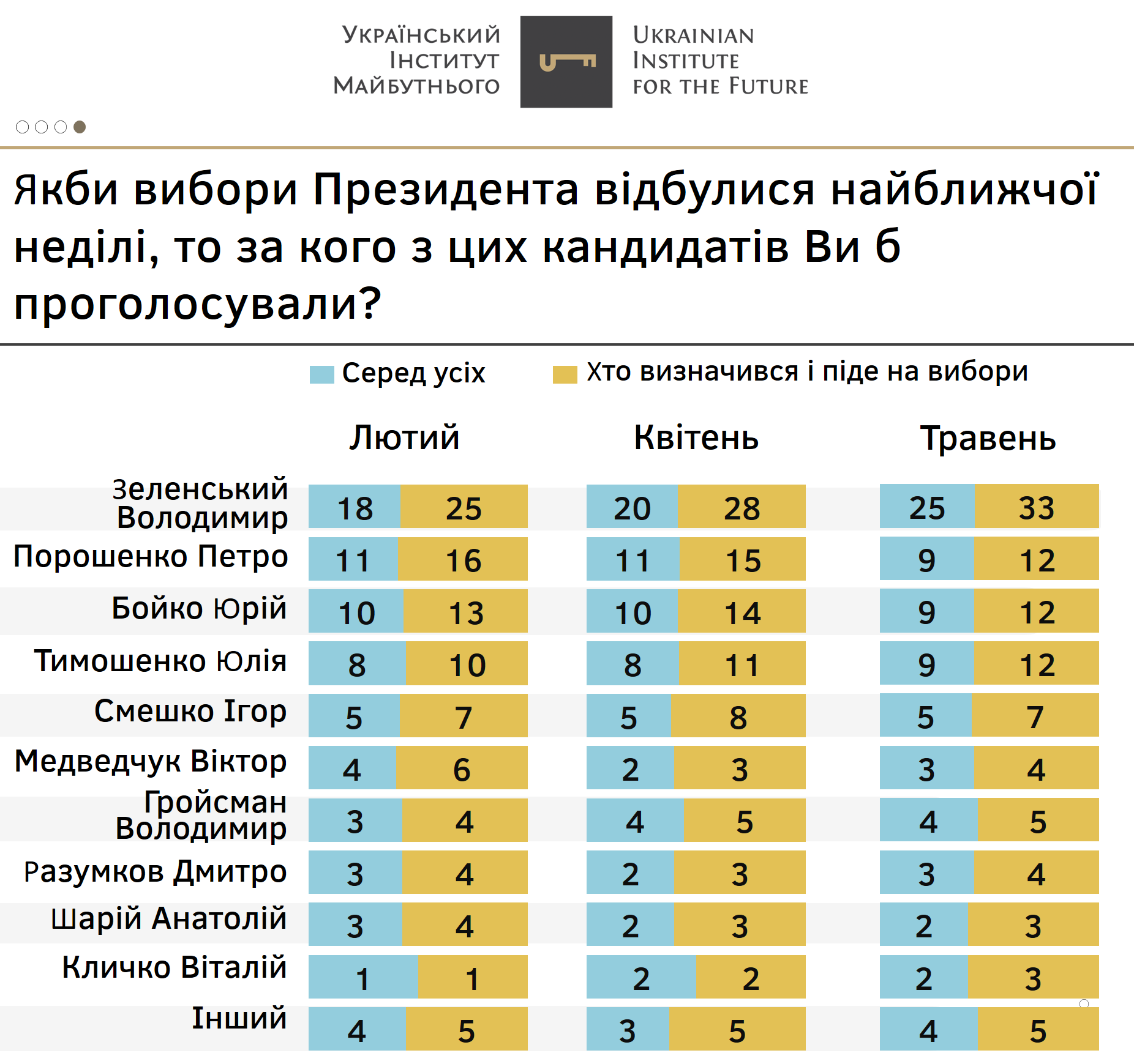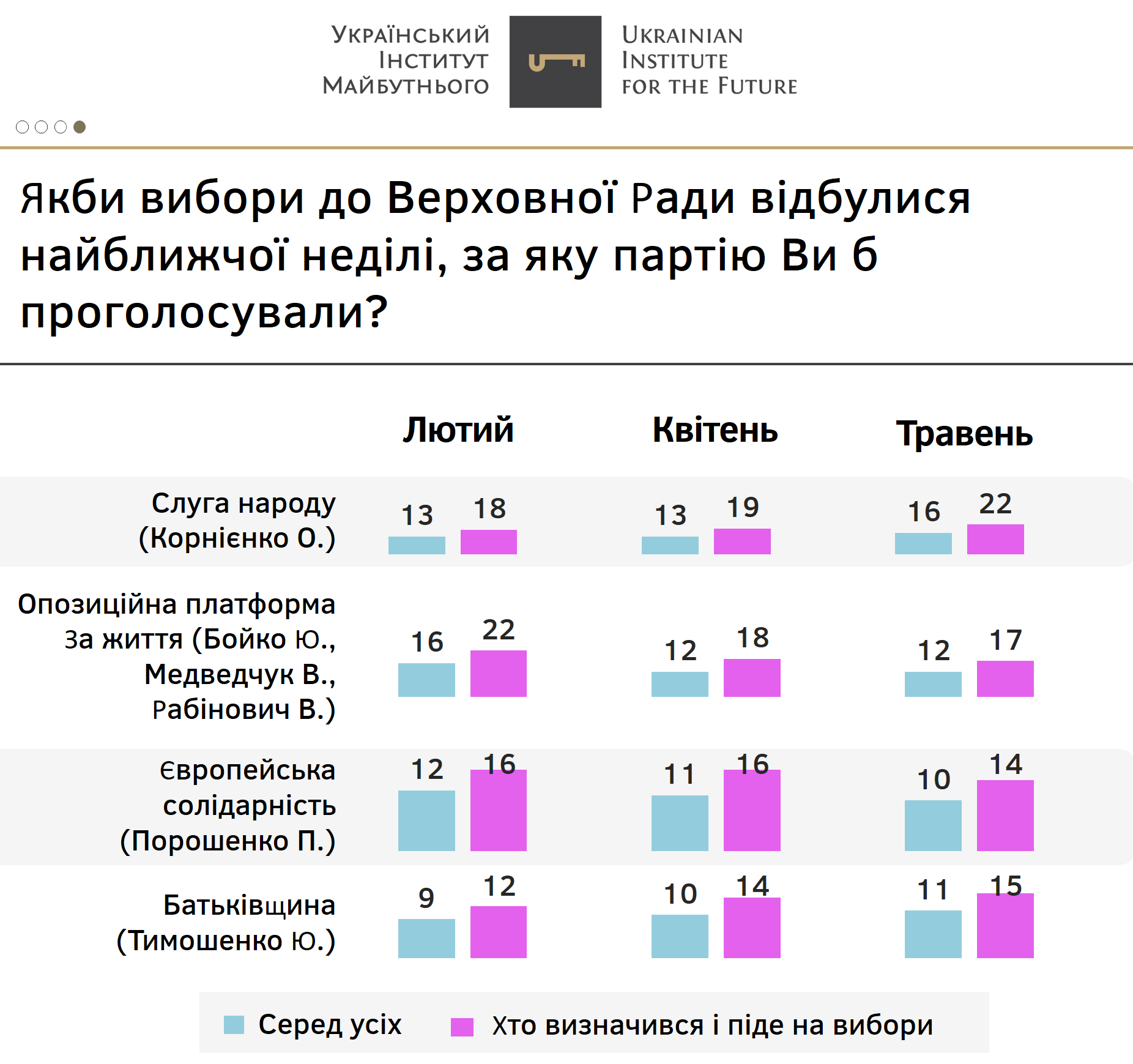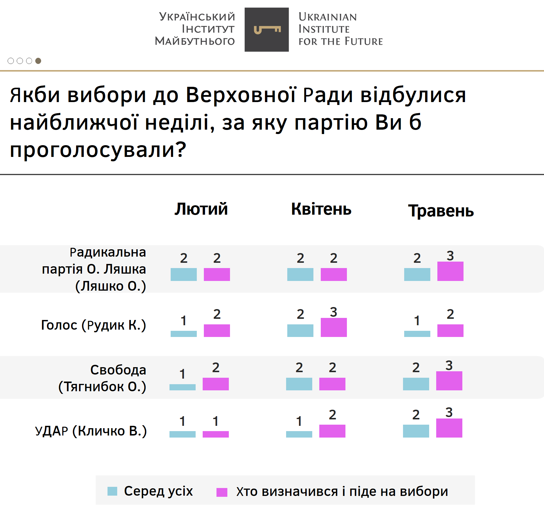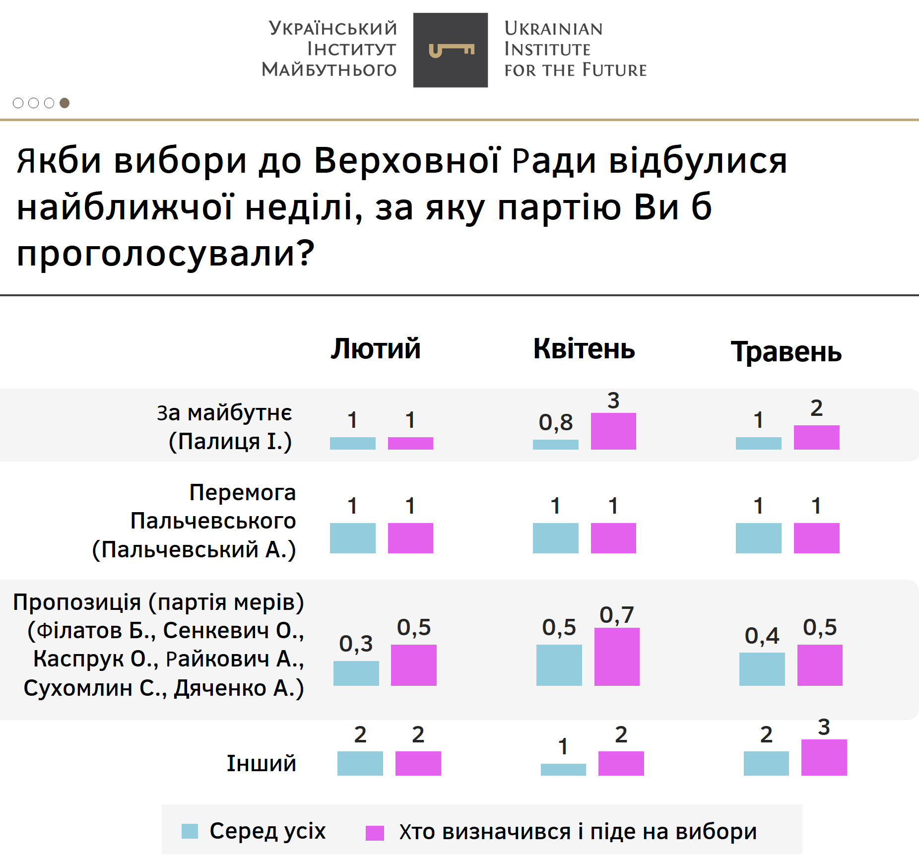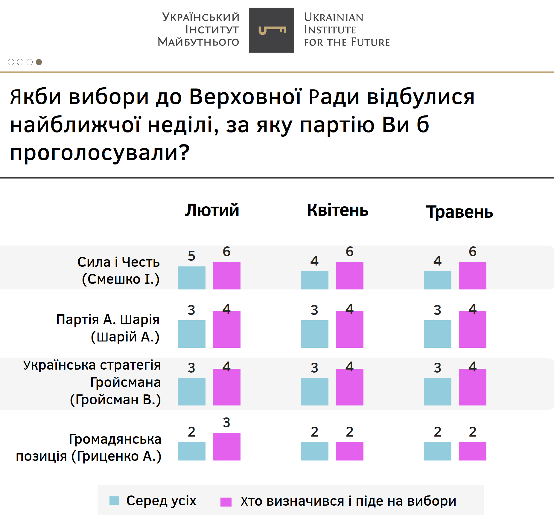 Усі інші партії, як і у попередні місяці, не перетинають п’ятивідсотковий бар’єр у абсолютних значеннях.