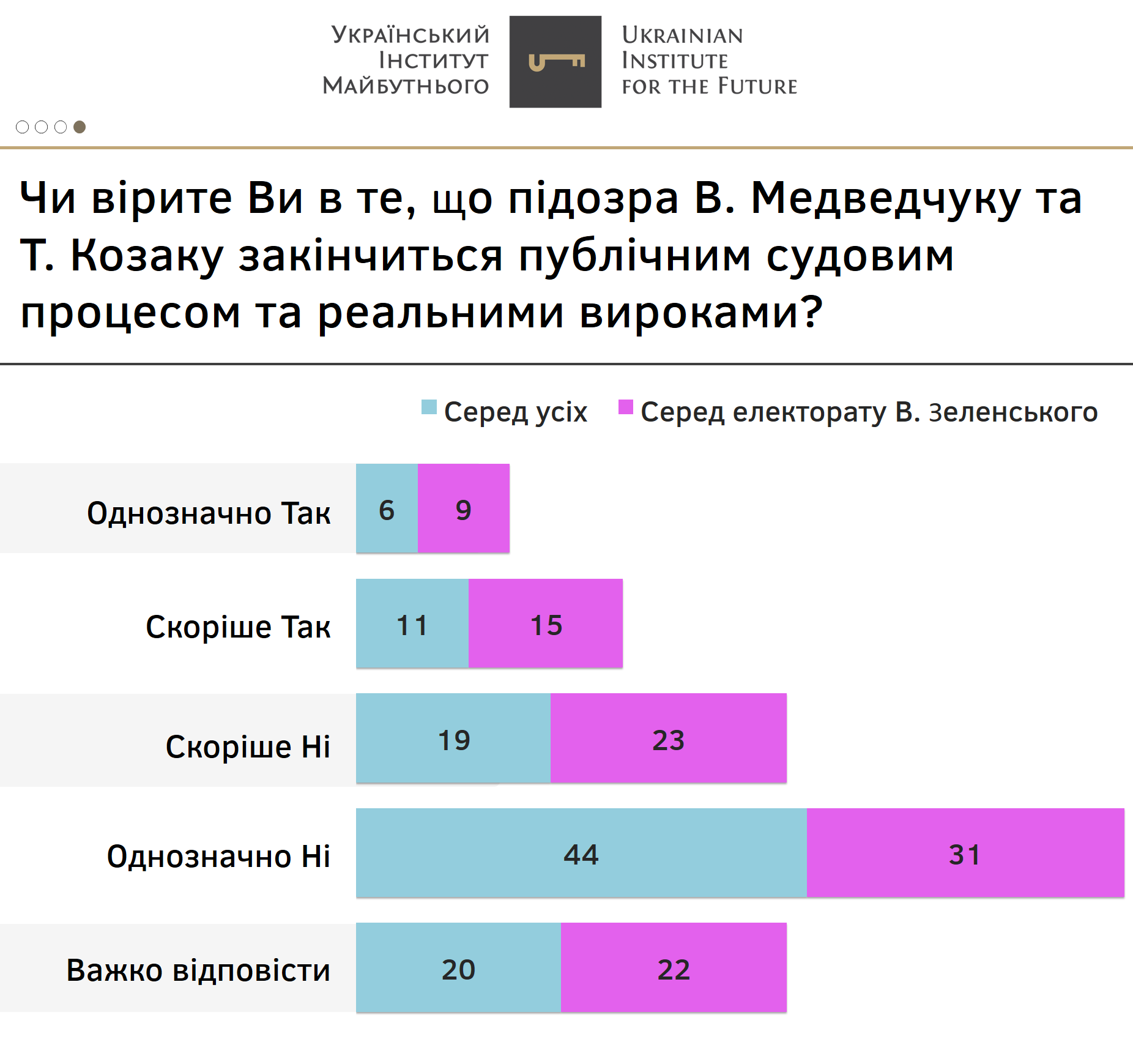 Навіть серед електорату В. Зеленського кількість скептиків перевищує кількість тих, хто вірить у реальні вироки, у понад два рази (53% до 24% ).