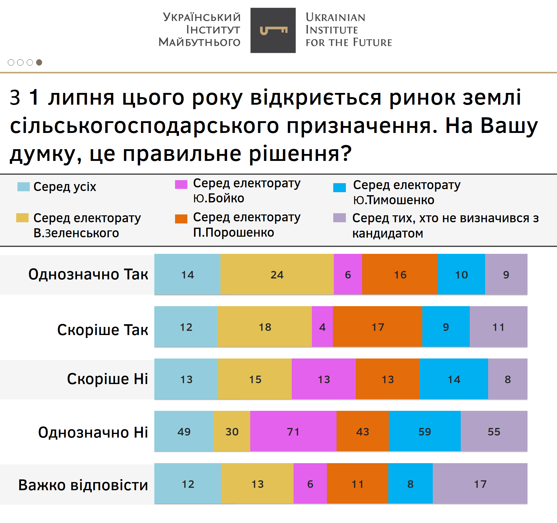 Серед усіх електоральних груп основних політичних гравців немає підтримки відкриттю ринку землі. Особливо серед виборців Ю.Бойко (84% противників) та Ю.Тимошенко (73% противників).