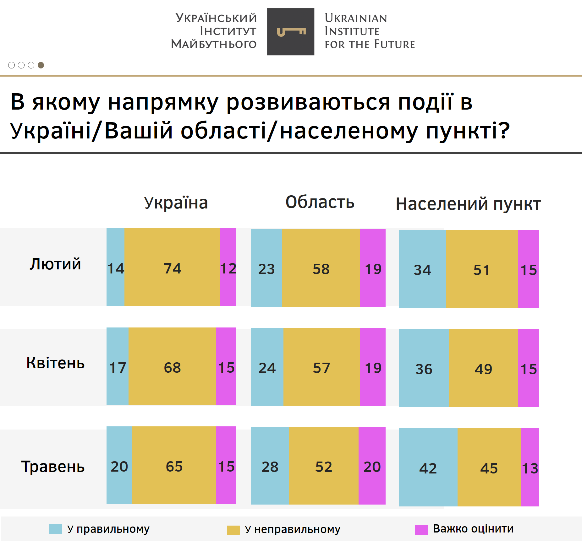 Жителі всіх макрорегіонах одностайно притримуються думки, що рух в Україні відбувається у неправильному напрямку. Як і у попередніх опитуваннях, порівняно менше негативно налаштовані у Центрі і, навпаки, найгірше – на Донбасі.