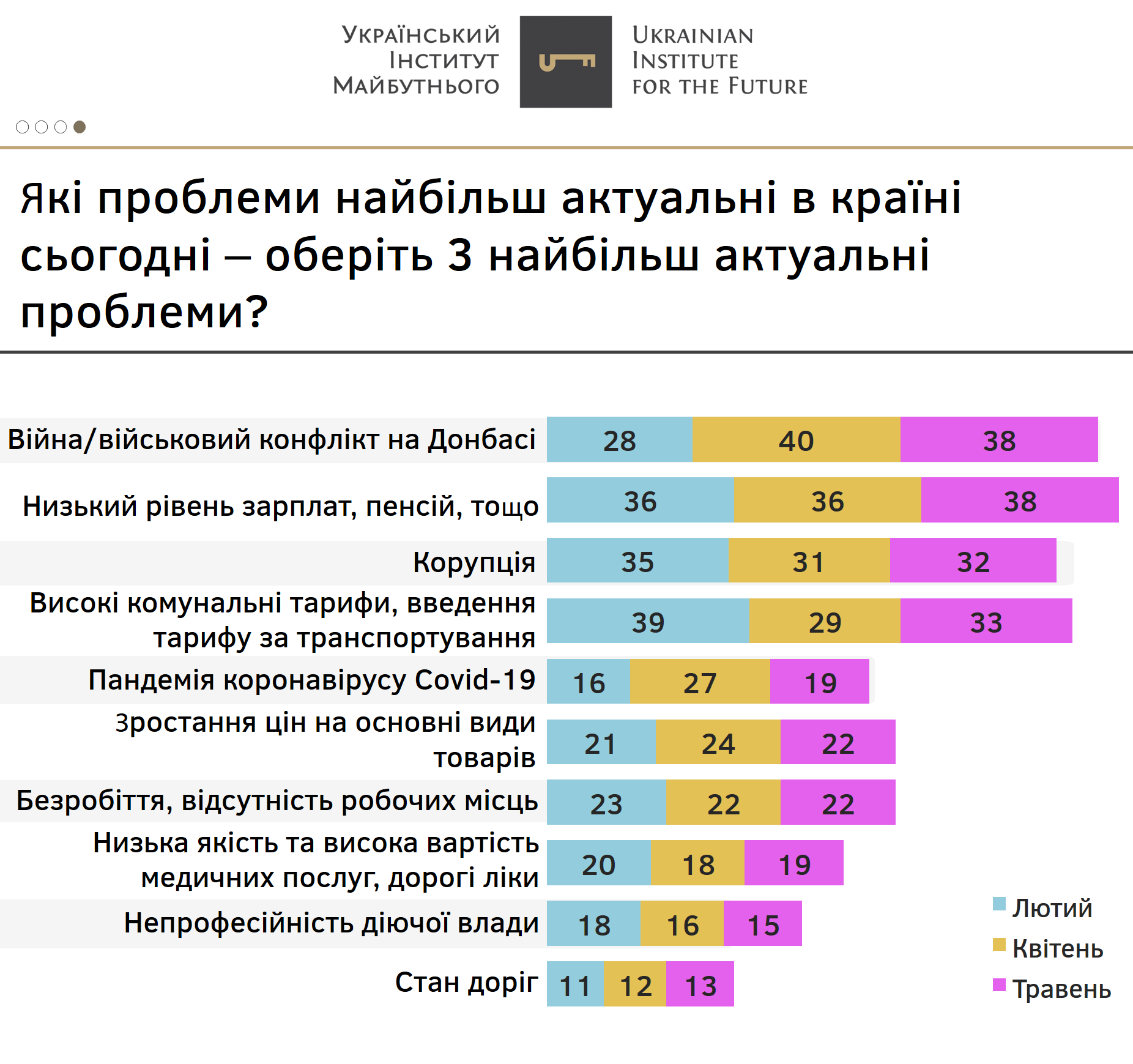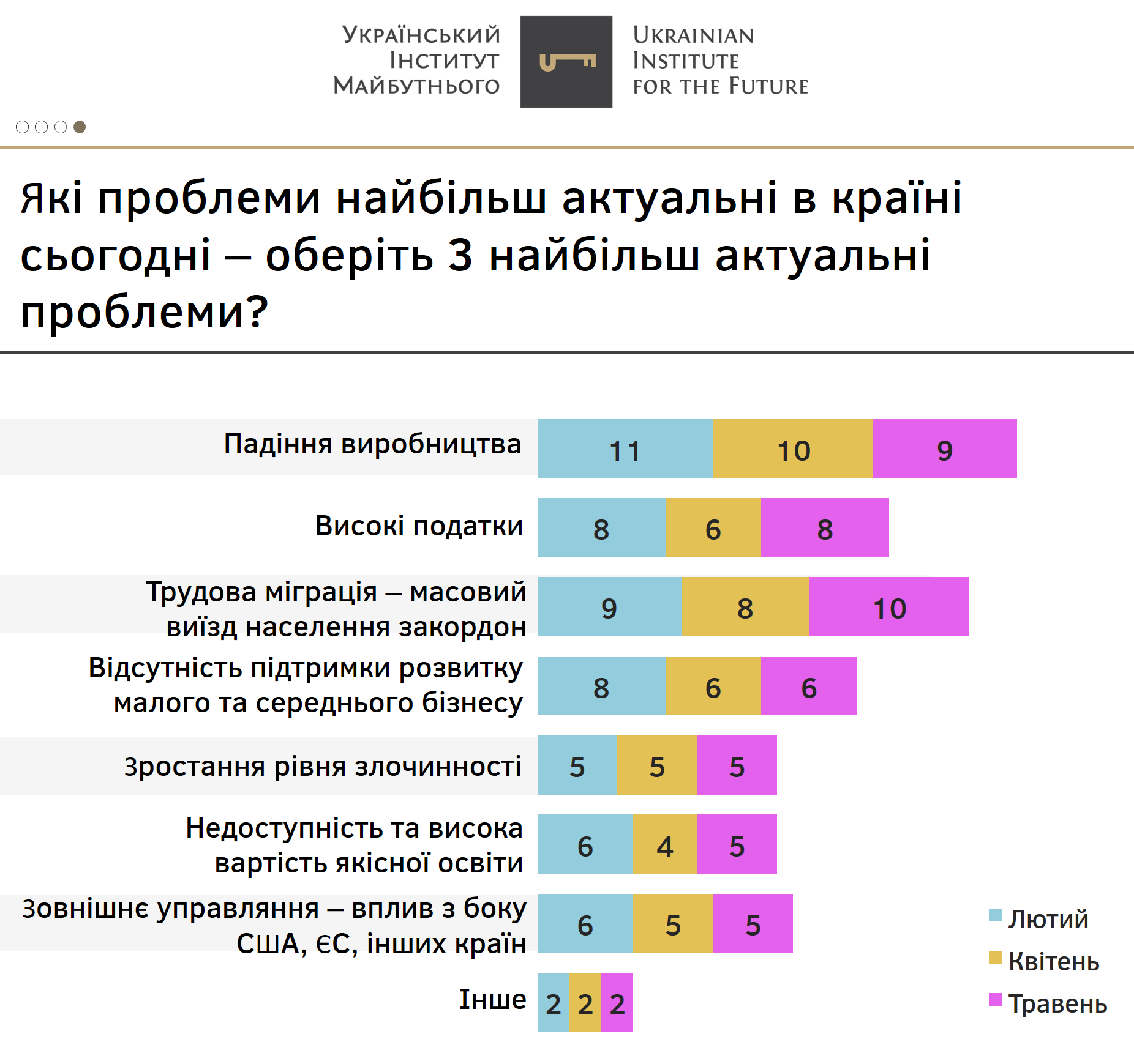 Подібно до минулих досліджень, між різними соціально-демографічними групами немає різких розбіжностей у визначенні найбільш актуальних проблем України.