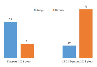 Трамп уже остаточно перестав бути для українців «добрим дядечком з-за океану», а Вашингтон стрімко втрачає статус вірного українського союзника. На сайті Київського міжнародного інституту соціології опубліковано результати досліджень, де, серед іншого, йдеться про різку зміну в гірший бік думки українців про президентство Дональда Трампа. Якщо в грудні 2024 року 21 % українців вважали президентство Трампа «поганим для України», то в березні 2025 року цей показник зріс до 73 % (див. діаграму 1).
