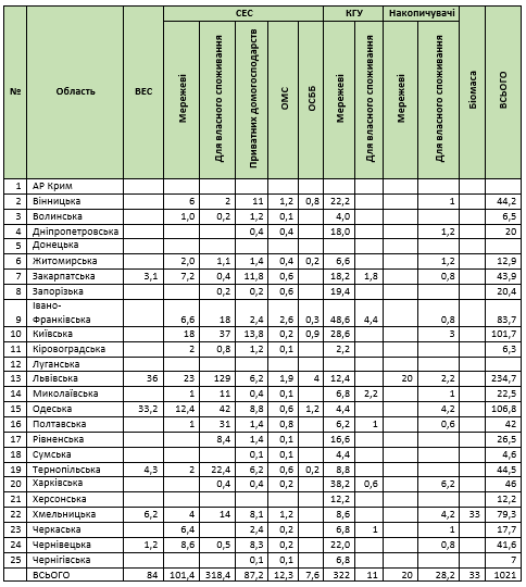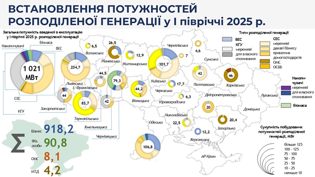 Отже, сумарно маємо встановлену потужність розподіленої генерації за перше півріччя 2025 року – 1 021 МВт (для порівняння: за весь 2024 рік – 944,767 МВт), з них підключені до електромереж 647,6 МВт (у 2024 році – 106,374 МВт).