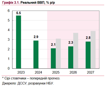 НБУ погіршив свій прогноз щодо зростання Української економіки як у 2025 році з 3.1% до 2.1% ВВП, так і в 2026 та 2027 роках.