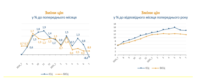 Споживчі ціни в липні 2025 року порівняно з червнем 2025 року знизилися на 0,2%, порівняно з липнем 2024 року зросли на 14,1%.