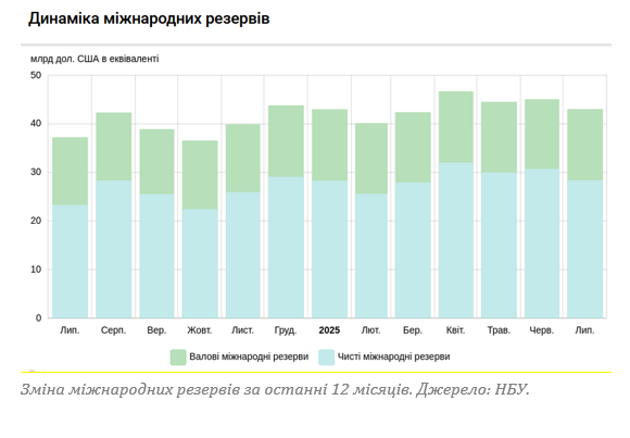 Міжнародні резерви у липні 2025 року зменшились з 45,1 до 43,0 млрд доларів.