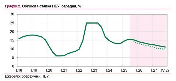 Оновлений прогноз НБУ вже передбачає триваліше збереження облікової ставки на рівні 15.5% (до IV кварталу 2025 року) та її повільніше зниження порівняно з квітневим прогнозом.