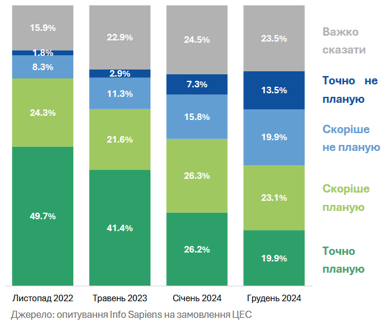 За данними Центру економічної стратегії,у 2024 році суттево знизилось кількість тих, хто думає повернутися в Україну: з 52.5% до 43%.