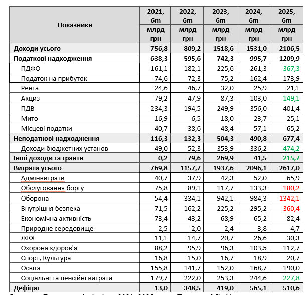 Зведений бюджет за 1 півріччя 2025 року було закрито з дефіцитом 510,6 млрд гривень проти 565,7 млрд гривень за 1 півріччя 2024 року. При цьому доходи зведеного бюджету вже на 575,5 млрд вищі, ніж були рік тому, а витрати на 521,0 млрд гривень вищі, ніж були рік тому.