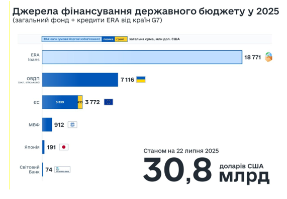 У липні 2025 року Україна отримала зовнішнє фінансування за програмою ERA (із доходів на заморожені активи Росії) обсягом 1 млрд євро від ЕС.