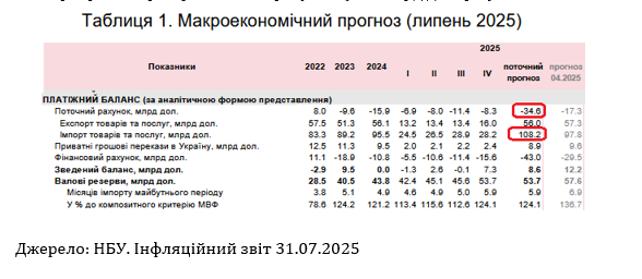 НБУ значно погіршив свій прогноз торгового балансу у 2025 році до – 52.2 млрд доларів. Це 25% ВВП. НБУ збільшив свій прогноз щодо імпорту товарів та послуг с 97.8 до 108.2 млрд доларів (+10.4 млрд доларів)