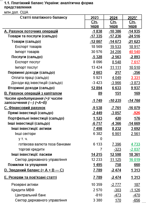 Таким чином, негативне сальдо рахунку поточних операцій за І півріччя 2025 року досягло відмітки 14.9 млрд доларів.