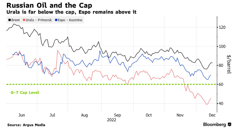 З того ж 5 грудня, країни G7, ЄС та Австралія запровадили застосування граничної ціни (прайс-кеп) на російську нафту – $ 60 за бар, який передбачає заборону операцій страхування вантажів нафти, якщо вона була продана вище цінової стелі. Країни погодились переглядати прайс-кеп що два місяці. Понад 90 % світового морського фрахту страхується групою міжнародних страхових компаній, зареєстрованих є Європі, що дає змогу контролювати поставки.