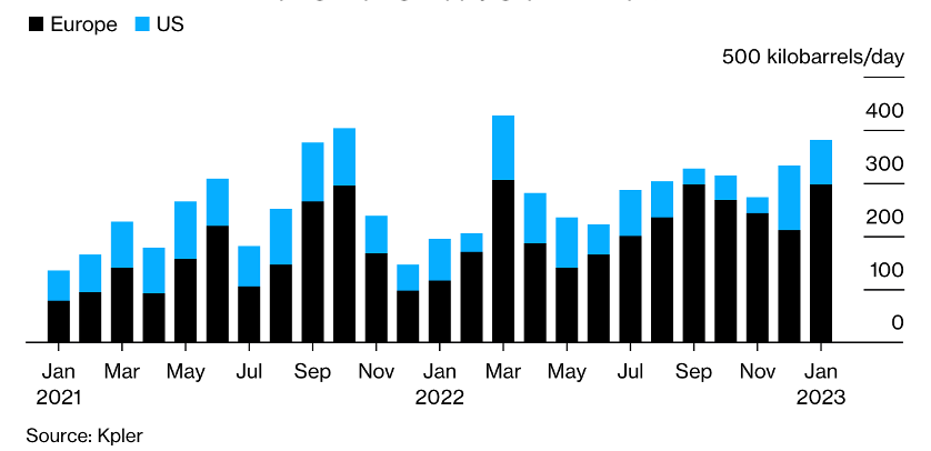 Від 5 лютого вступило в дію ембарго ЄС на поставки нафтопродуктів з обмеженням цін, а раніше з 5 грудня чинності набули аналогічні ж заходи щодо постачань російської сирої нафти. Ринок країн, які ввели ембарго на нафтопродукти складали 2/3 усього російського експорту дизпалив та мазуту.