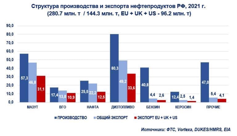 При цьому, на США, Великобританію та ЄС – країни, що оголосили заборону на імпорт російських нафтопродуктів, у 2021 році припадало 68,3 % загального експорту дизелю та 66,5 % експорту мазуту, і відповідно 41,8 % від загального виробництва дизеля та 54,2 % від виробництва мазуту. Канада та Австралія підтримали заборону, але на них припадали мізерні обсяги поставок.