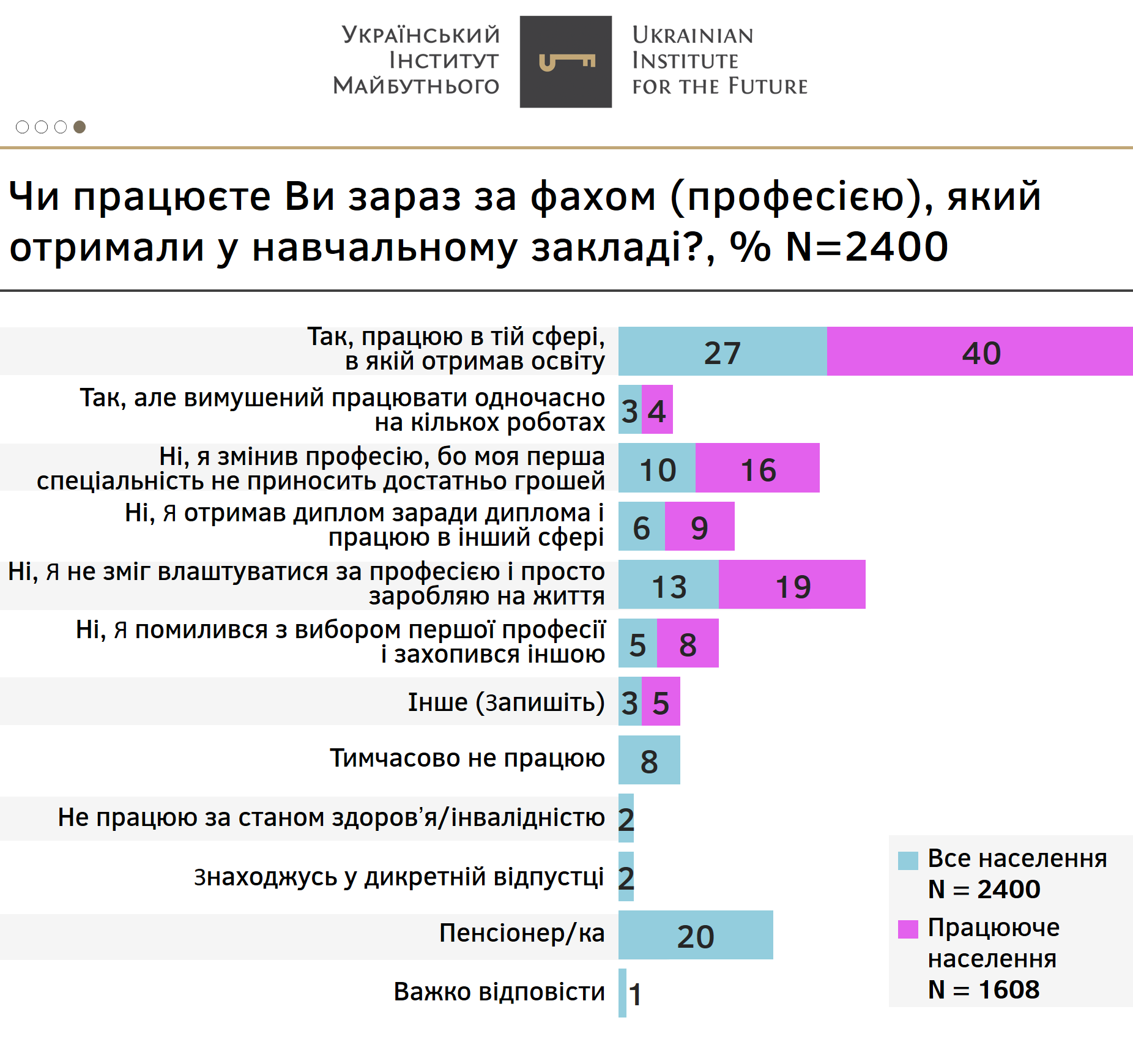 А тепер повернуся до першої очікуваної для мене відповіді. Більш того, такої, з приводу якої не варто перейматися. Так, менше третини (30%) громадян працюють за фахом, який вони отримали у навчальному закладі. Якщо взяти лише населення, що працює, то пропорція тих, хто зайнятий за своїм першим фахом, складає 40%, а більшість все рівно змінила професію з тієї чи іншої причини. По-перше, зміна професії – це цілком нормальний тренд у сучасних умовах. І сам факт, що люди це роблять, свідчить про адаптивність і таки – здатність навчання (хай навіть і не декларовану). По-друге, про те, що у сфері освіти, передусім вищої – варто ввести диференціацію на університети і професійні школи. Університети не мають бути кузнями кадрів. Їхнє завдання – готувати науковців, публічних інтелектуалів (ці самі для себе створюють робоче місце), або ширше коло тих, хто виходить з alms mater із ключовою навичкою – самостійно мислити, ухвалювати рішення і вміти навчатися. Саме це має їм допомогти успішно будувати персональний бренд, кар’єру, біографію та нові інституції. Залишається для цього лише побувати справжні університети.