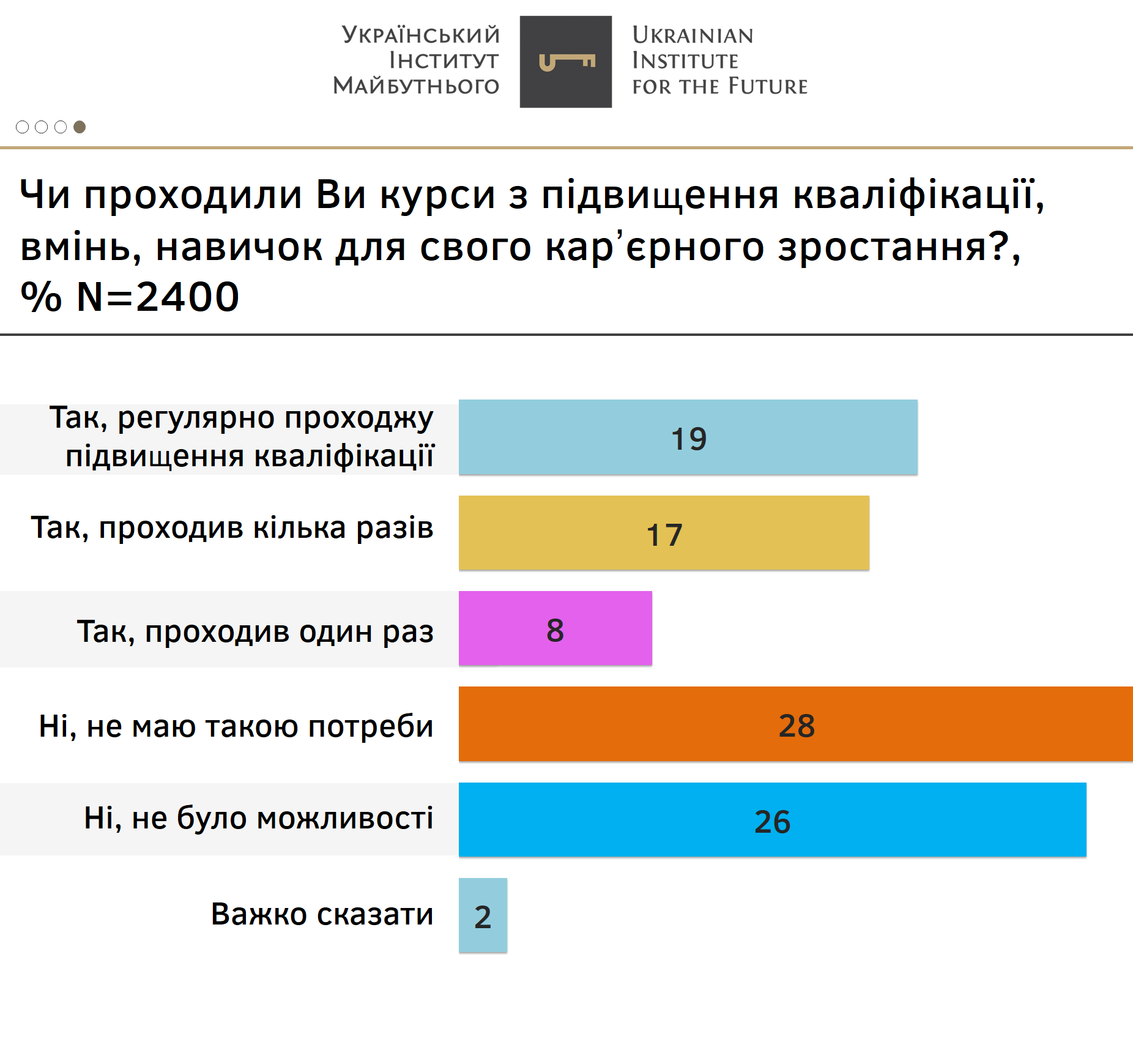 На цьому тлі відповіді українських респондентів виглядають геть не оптимістичними: більше половини наших громадян, а точнше 54%, відповіли, що ніколи не проходили курси з підвищення кваліфікації через відсутність потреби або можливості. Регулярно їх проходить п’ята частина опитаних (19%) і ще майже стільки ж (17%) проходили їх кілька разів. Загалом, хоча б один раз такі курси проходили 44% респондентів. Звісно, тут можна списати частину таких відповідей на формулювання запитання, бо «курсів з підвищеня кваліфікації» у багатьох секторах давно немає. Натомість буденністю стають корпоративне навчання, тренінги, онлайн-курси. Але припускаю, що зонд соціологів натрапив тут на таку ситуацію, де старі формати професійного розвитку ВЖЕ зникли, а нові ЩЕ прижилися. Отже, утворилася порожнина, що для окремих галузей, особливо інфраструктурних, може виявитися катастрофічною.