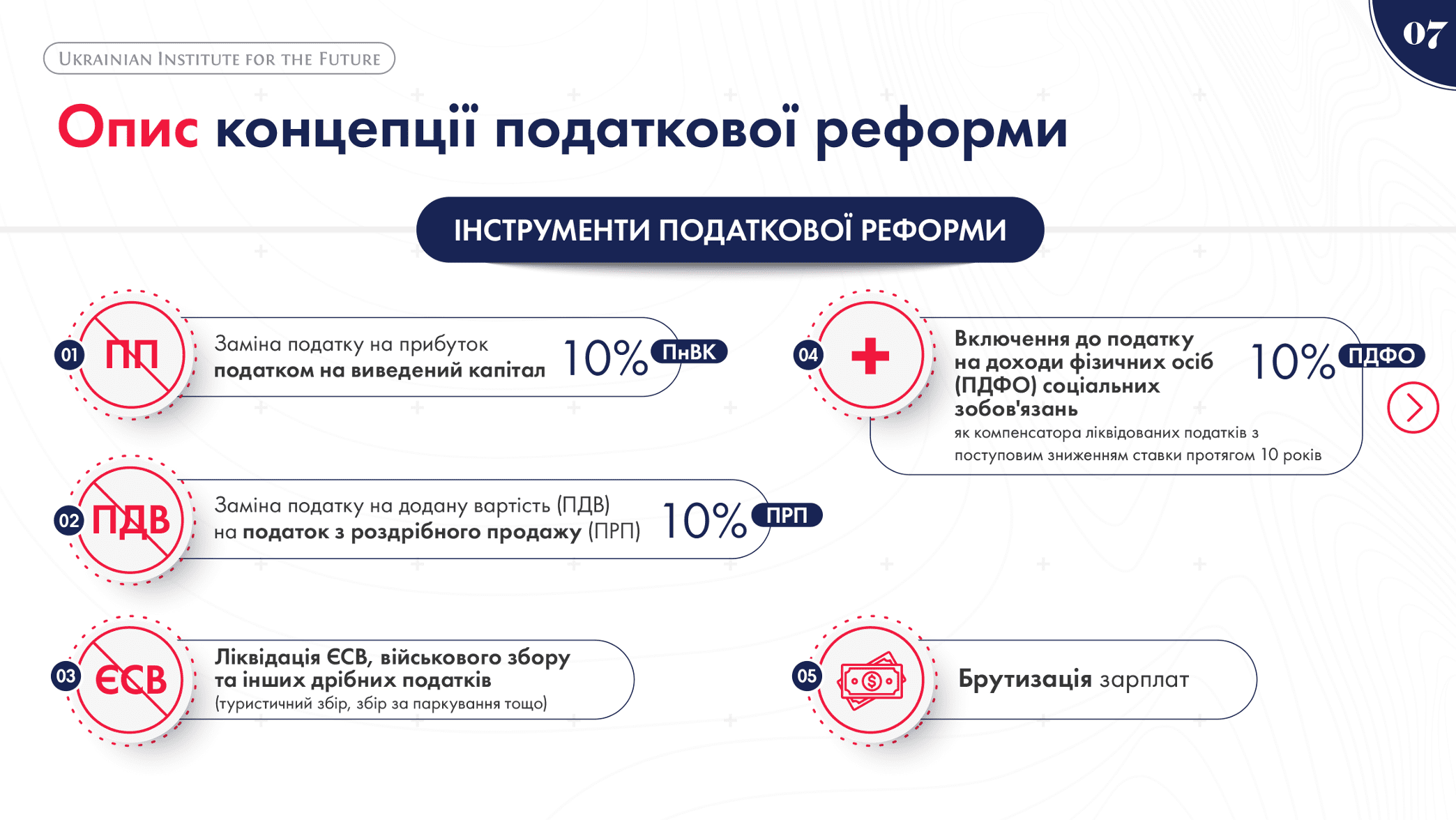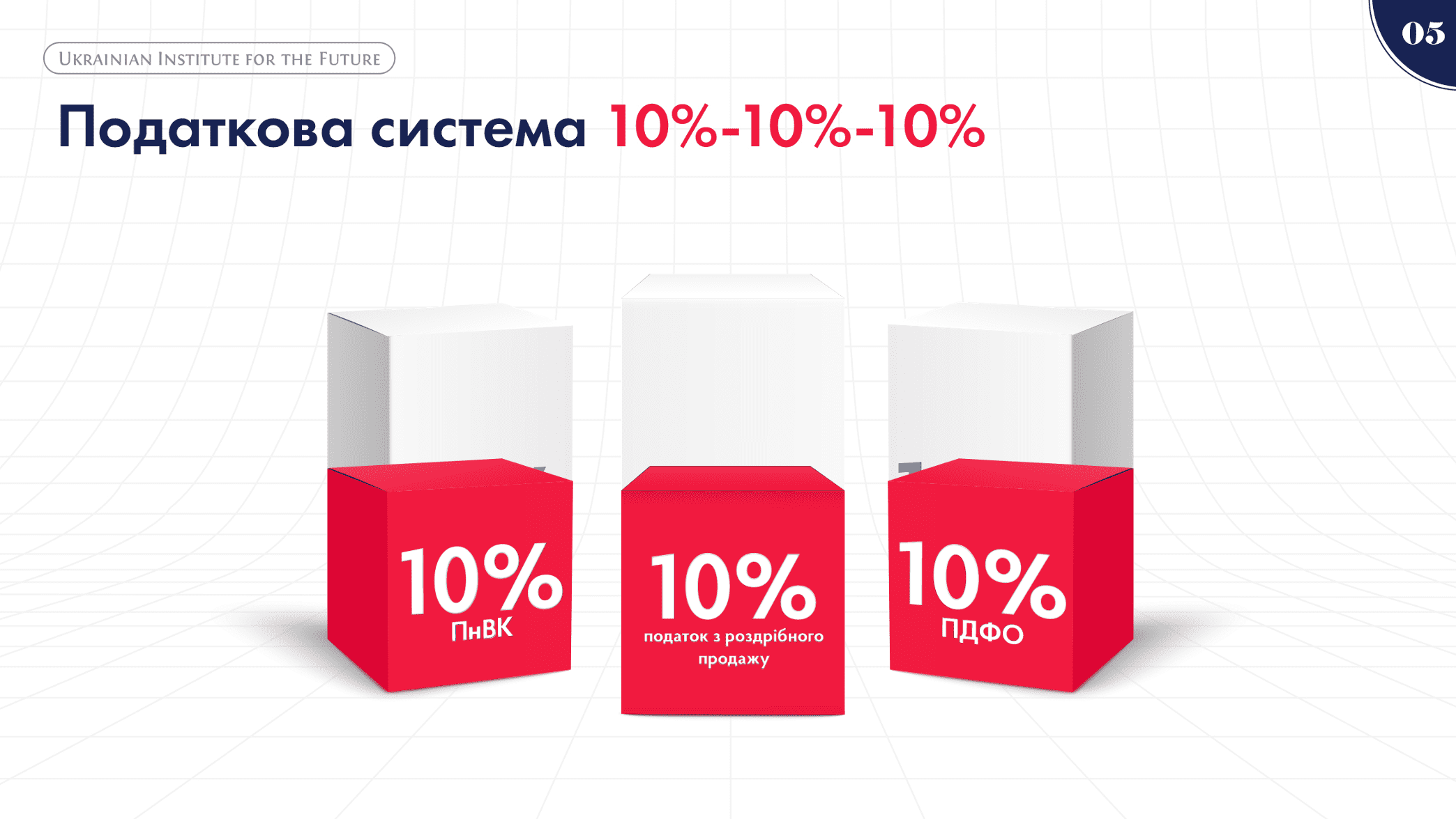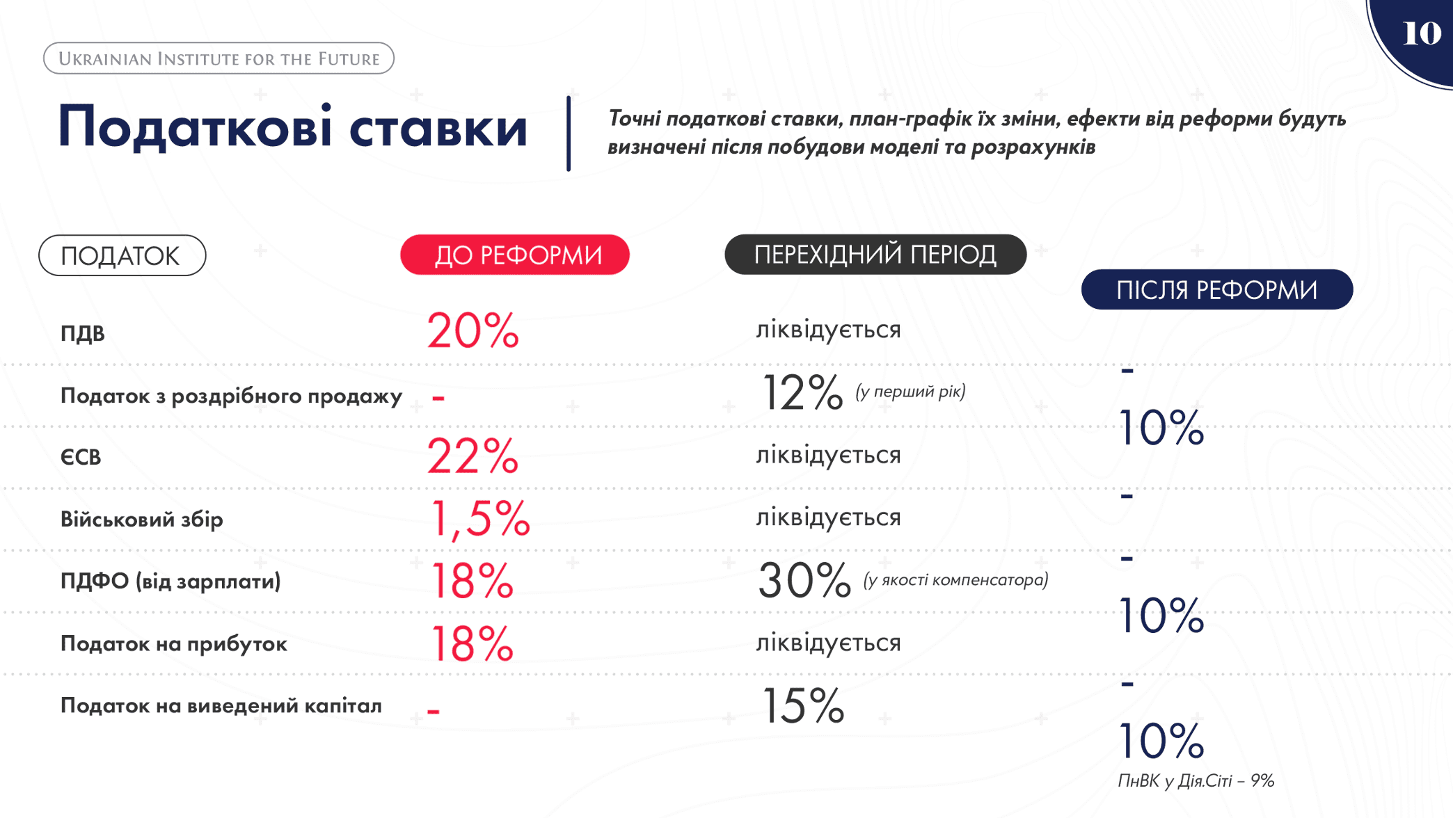 Тож у концепції експерти Українського інституту майбутнього зазначили, що податкова реформа передбачає зниження податкового навантаження: 10% – податок з роздрібних продажів (замість 20% ПДВ); зниження до 10% – ПДФО; 10% – податок на виведений капітал (замість 18% податку на прибуток). А ПДВ, ЄСВ, податок на прибуток, військовий збір та інші дрібні податки – ліквідовуються.
