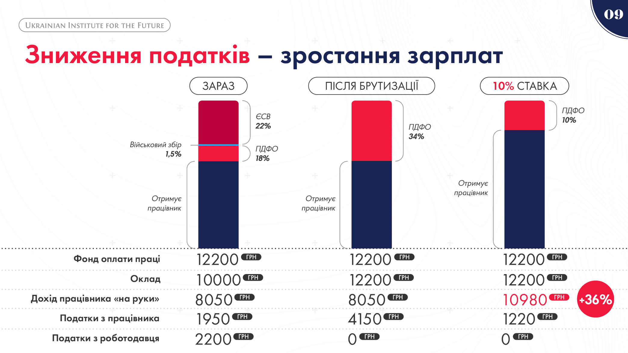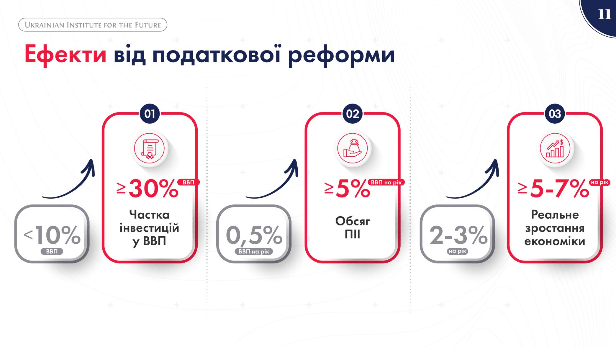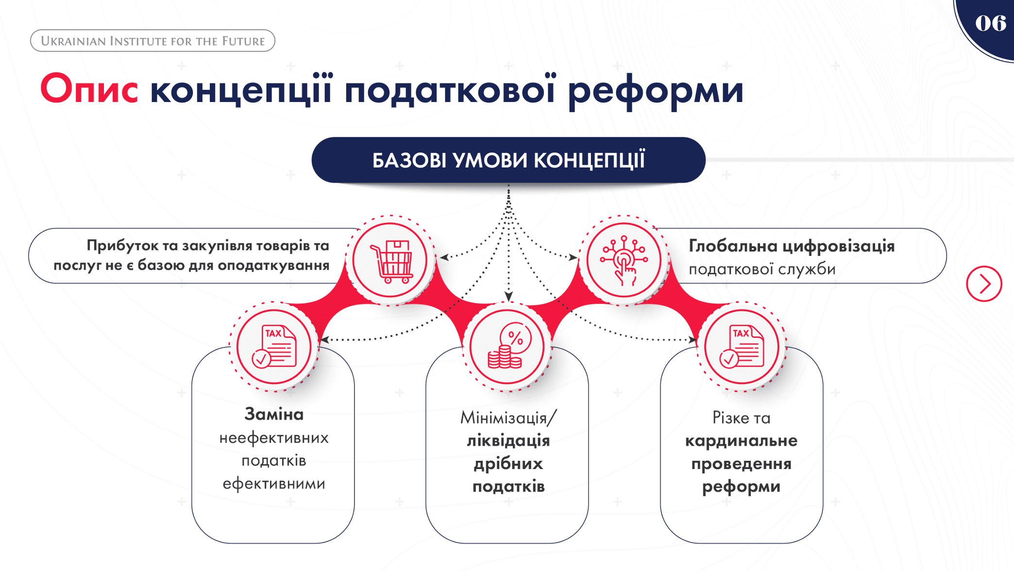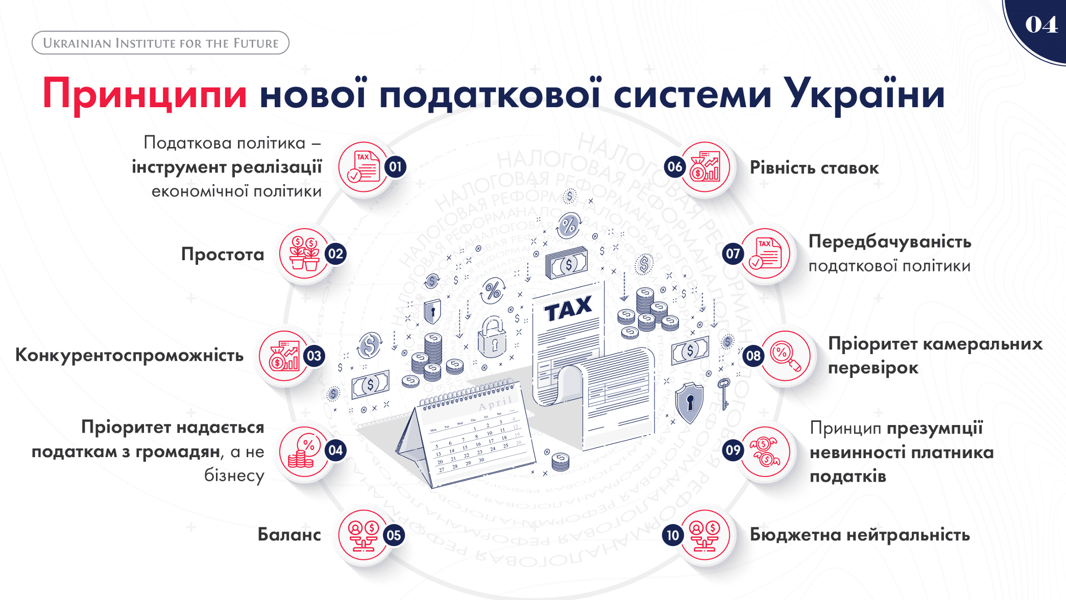 Тож у концепції експерти Українського інституту майбутнього зазначили, що податкова реформа передбачає зниження податкового навантаження: 10% – податок з роздрібних продажів (замість 20% ПДВ); зниження до 10% – ПДФО; 10% – податок на виведений капітал (замість 18% податку на прибуток). А ПДВ, ЄСВ, податок на прибуток, військовий збір та інші дрібні податки – ліквідовуються.