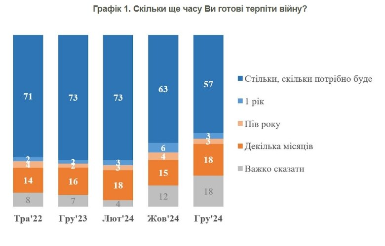 Водночас з 2022 до 2024 року кількість українців, готових терпіти війну “стільки, скільки буде потрібно”, знизилася на 14%. Зазначається, у грудні 2024 року більшість українців (57%) готові терпіти війну стільки, скільки буде потрібно. Ще 3% опитаних заявили, що готові терпіти війну один рік, 3% – пів року, 18% – декілька місяців. Вагаються з відповіддю 18%.