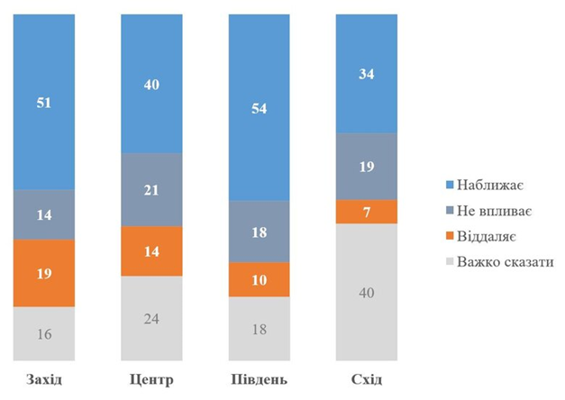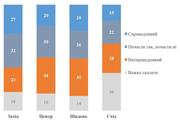 Так, лише 7% переконані, що мир може бути повністю справедливий для України. Лише 11% мають думку, що мир буде повністю несправедливий для України. Більшість же українців перебувають між цими крайніми думками й питання більше в пропорції – чи буде більше виконання вимог України, чи, навпаки, більше виконання вимог Росії.
