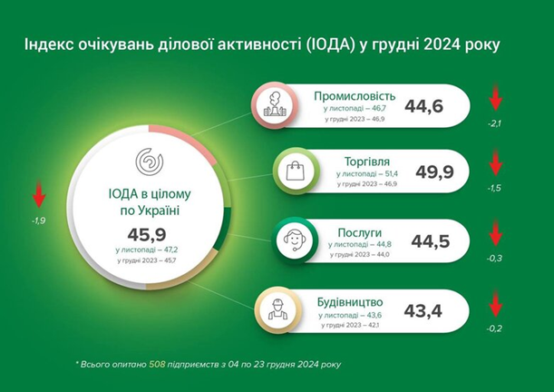 Про це свідчить індекс очікувань ділової активності (ІОДА), який у грудні минулого року знизився до 45,9 пункта, порівняно із 47,2 у листопаді, 49,4 – у жовтні, 48,7 – у вересні, 48,4 – у серпні та 44,4 – у липні.