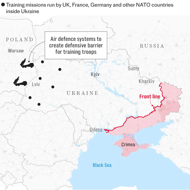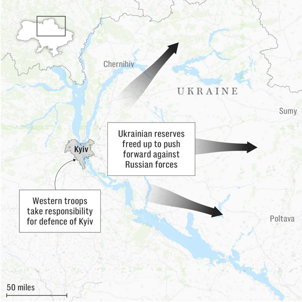 Сценарій №2: Забезпечення захисту Києва та інших регіонів західними військами, що дозволить вивільнити українські війська для боротьби з Росією по лінії зіткнення.