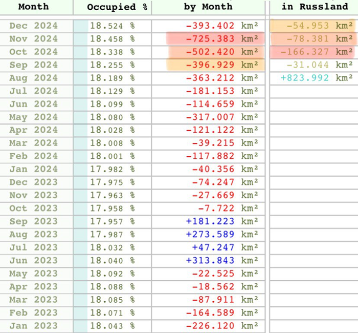 Загалом оперативна обстановка у районах ведення наземних бойових дій та морських операційних зонах для українських військ залишалася складною та характеризується просуванням росіян у ключових для них секторах/напрямках. Деталізовані дії противника та Сил оборони на кінець звітного періоду (станом на 08.00 05.01.2025) згідно оцінок ГШ ЗСУ:
