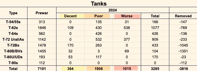 За їхніми оцінками (можливо, частково перебільшеними через неповні вхідні дані) у РФ залишилося 364 танки в хорошому стані (109 Т-62, 170 Т-72Б, 32 Т-80Б/БВ, 53 Т-80У/УД). В поганому технічному стані вони нарахували 1906 танків., в дуже поганому – 1015 од.